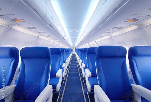 aeroplane, aircraft, plane, cabin, interior, aviation, airline, flight, travel, transport, transportation, modern, empty, clean, nobody, passenger, seat, blue, white, wall, carpet, aisle, space, row, sky, window, business, class, first, economy, lounge, commercial, fly, journey, trip, vehicle, chair, design, architecture, futuristic, sterile, bright, light, neat, pristine, simple, minimalist, inside, air