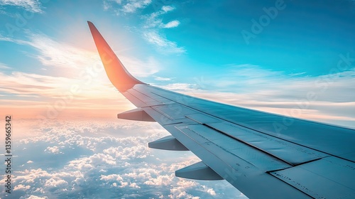An airplane wing cutting through the vibrant blue sky, with sunlight reflecting off the metal surface.