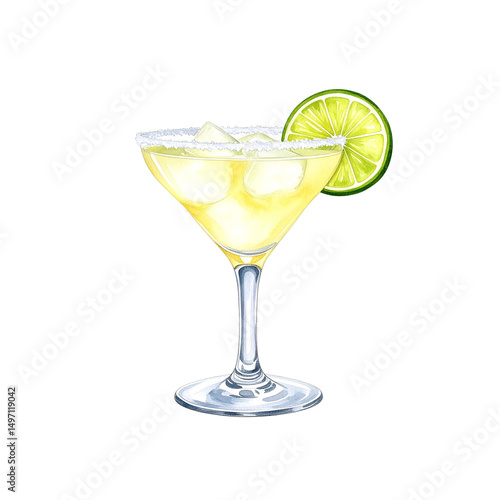 An alcoholic cocktail drink with green lime and ice in a glass, isolated on white, cool and refreshing for a party