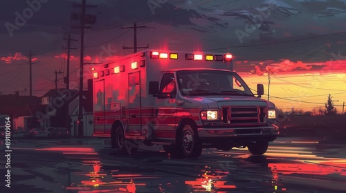 ambulance, sunset, emergency, vehicle, light, road, night, first, aid, transport, high-coloured, night time, motion, response, artwork, service, twilight, urban, beauty, health care, medicals, colours, duty, landscape
