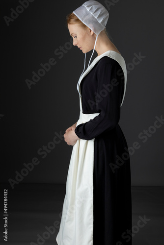 An Amish woman wearing a black dress with a white apron and cap standing against a studio backdrop