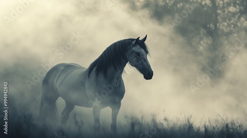andalusian, horse, mist, aethereal, coat, shimmering, light, mane, breeze, muscle, fog, glow, pattern, mystery, calmness, silhouette, tree, haze, depth, enchanting, scene, serene, dreamlike, grace, majesty, noble, creature, nature, landscape, equine, beauty, atmospheric, delicate, wildlife, magic, illumination, photo, artistic, tranquil, harmony, powerful, elegant, motion, foggy, soft, iconic