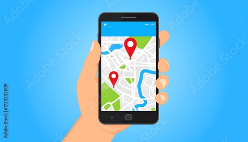 An animated illustration shows a human hand holding a smartphone with a map app displaying two red location markers