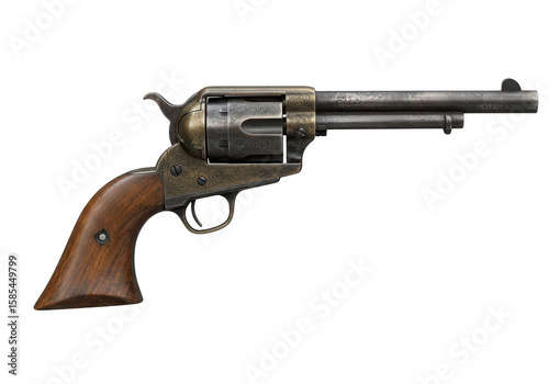 An antique western revolver handgun with a wooden grip, isolated on a transparent background