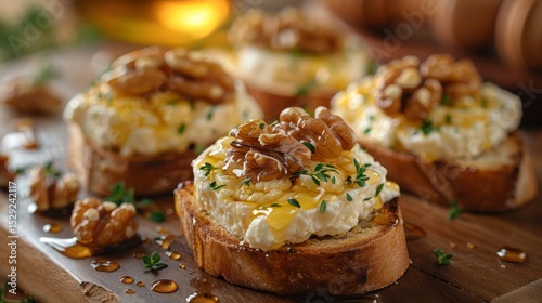 An appetizing arrangement of toasted bread topped with creamy cheese, crunchy walnuts, and a drizzle of honey, showcasing a perfect balance of flavors.