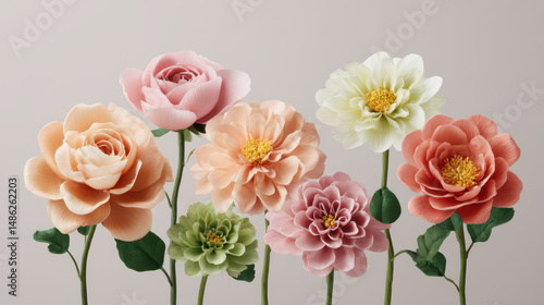 An arrangement of beautifully crafted paper flowers in pastel shades, with roses and dahlias creating an elegant, soft, and visually appealing composition.