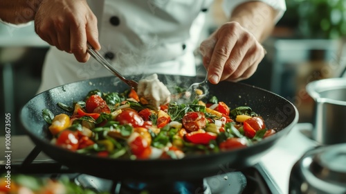 An array of colorful vegetables sizzling in a skillet, expertly sautéed by a chef, highlighting the vibrancy and healthiness of this freshly cooked dish.