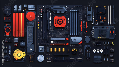 motherboard, component, technology, design, hardware, electronic, layout, circuit, graphic, assembly, part, visual, arrangement, innovation, system, tool, device, connector, power, memory, processing, cooling, cable, storage, functionality, modern, aesthetic, structure, efficiency, integration, accessory, visualisation, colours, pattern, organisation, engineering, creativity, precision, architecture, schematic, connectivity, performance, digital, interface