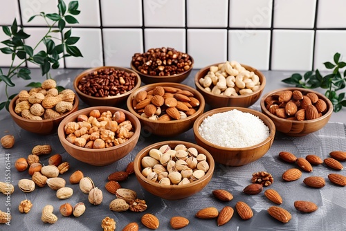 An array of healthy nuts in wooden bowls set on a modern kitchen countertop with a tiled background and plant decor