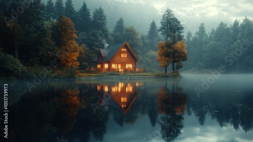 An artistic view of a house reflected in a calm lake, creating a serene atmosphere.