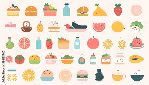 An assortment of colorful food items and drinks displayed in a flat design on a clean background from a direct viewpoint