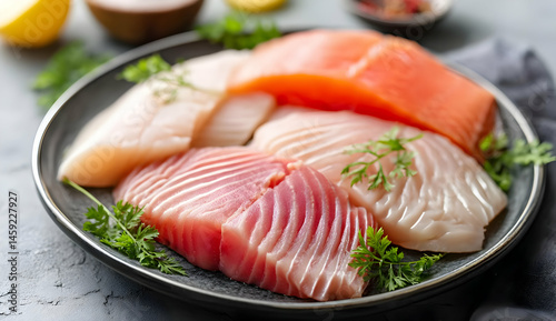 An assortment of fresh fish fillets presented on a dark plate, garnished with herbs and accompanied by lemon slices for a vibrant culinary display.