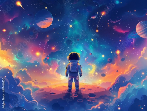 An astronaut is standing on the surface of a planet and looking up at a beautiful nebula in the sky.