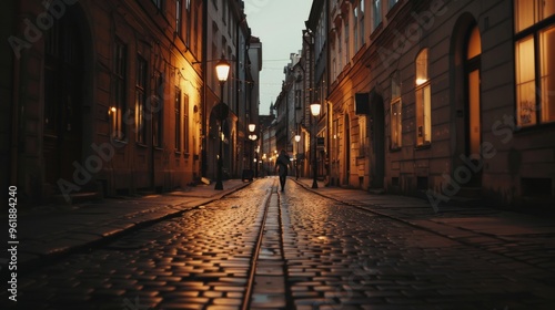 An atmospheric cobblestone street scene, softly lit by warm, vintage street lamps, with an individual walking alone in the distance at twilight.