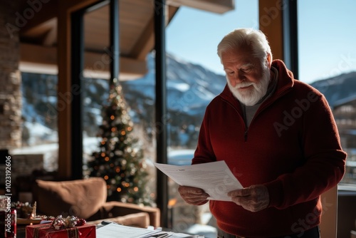 elderly, man, reading, document, christmas, tree, cosy, room, warmth, holiday, spirit, serenity, nostalgia, wisdom, calmness, festive, indoor, winter, scenic, mountain, snowy, leisure, contemplation, modern, architecture, glasses, window, fireplace, armchair, gift, package, wooden, cabin, nature, light, cheer, photo