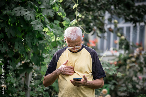 An elderly man relaxes a tense nerve in the chest area by pressing. Treatment remotely by phone. Online therapist. Teletherapy