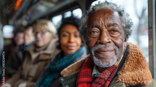 An elderly man with gray hair and a red scarf, seated on a bus, with other passengers slightly out of focus in the background, presenting a serene and thoughtful expression.