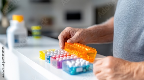 An elderly person organizing a seven-day medication dispenser with colorful pills on a bright table, focusing on health and routine management in daily life.