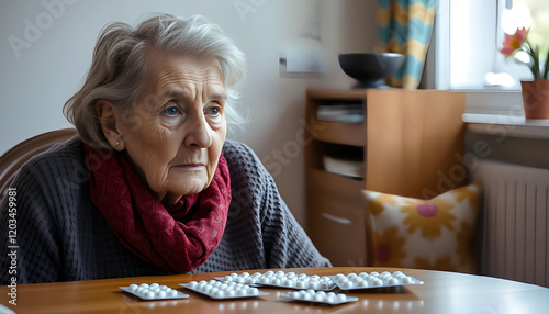 an elderly woman with gray hair sits at a table at home and in front of her on the surface of the table there are many different medicines. She is thoughtful and sad that she is ill