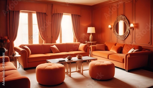 room, living, furniture, sofa, couch, design, interior, orange, colours, ottoman, table, lamp, mirror, curtain, window, wall, ceiling, light, decor, style, modern, elegant, home, plush, cushion, fabric, pattern, space, comfort, bright, classic, arrangement, set, decorative, cosy, wood, structure, frame, detail, vase, object, side, round, accent, panel, trim