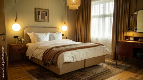 elegant, warm, double, bed, headboard, bedside, table, vanity, table, mirror, hardwood, floor, are, by, cosy, carpet, the, room, lit, pendant, light, lamp, natural, filtering, through, partially, open, curtain, from, corner, angle, or, directly, facing