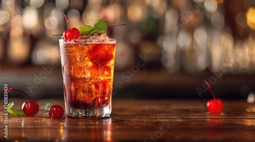 An elegant bar scene with a cherry-flavored beer cocktail, garnished with a cherry and mint leaf, on a polished wooden counter.