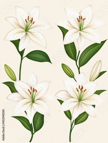 An elegant collection of watercolor-painted white lilies, meticulously detailed with subtle speckles and lush green leaves, perfect for elegant design projects and wedding
