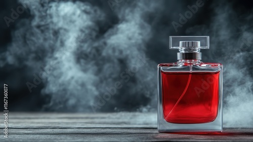 An elegant red perfume bottle sits gracefully amid swirling mist, symbolizing allure and sophistication, capturing the essence of luxury and timeless beauty in perfume design.