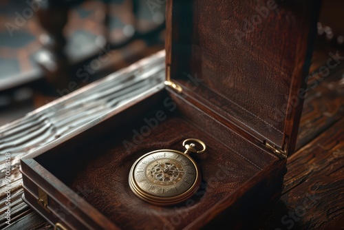 An elegant vintage pocket watch rests in a beautifully crafted wooden box, showcasing intricate details and timeless charm.