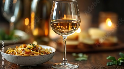 an elegant white wine glass with a filled bowl set against a soft focus background of a dining table