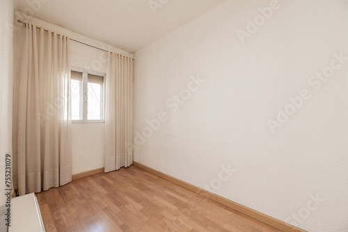 An empty room with light wooden floors and a double aluminum window with long white curtains