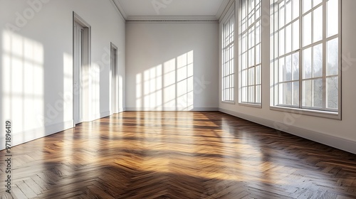 an empty room with wooden floors and white walls there is a large window in the wall to the right : Generative AI