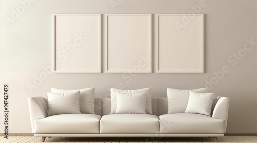 An empty wall with a blank white picture frames, a beige sofa, neutral colors, soft lighting, simple and elegant. Generative ai