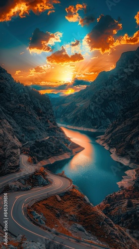 An empty winding road high in the Italian Alps, a lake in a gorge, sky illuminated by the sun's rays at sunset, incredible nature, bright saturated colors