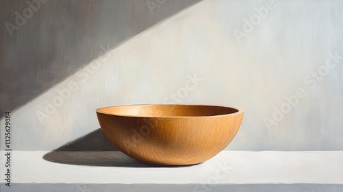 An empty wooden bowl, placed in the center of a large, light grey canvas with soft shadows cast, conveying stillness and simplicity