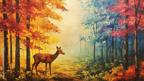 An enchanting scene of a deer quietly grazing among the colorful trees in a peaceful forest.