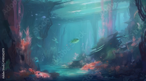An enchanting underwater world where coral reefs in shades of pastel pink, lavender, and mint surround schools of glowing fish. Gentle rays of light penetrate the water, creating a magical and serene