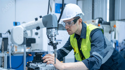 An engineer working with a robotic arm in an industrial environment, focused on his task with precision