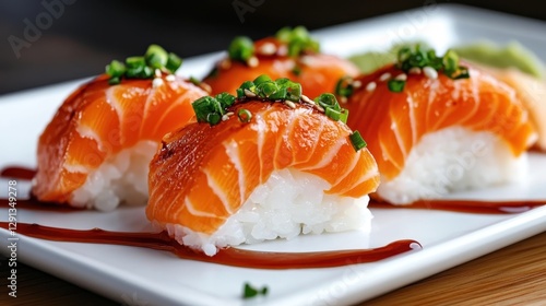 An enticing display of sushi featuring layers of fresh salmon on rice, enhanced with soy sauce and garnished with chives, perfect for any sushi lover.