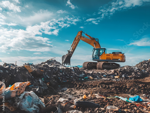 An excavator works at a garbage dump. Neural network AI generated art