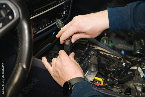 screwdriver, disassemble, employment, hand, gearlever, job, dashboard, tool, repairing, repairman, inside, salon, workshop, defect, spare part, transport, technician, malfunction, service station, mechanism, harness, workplace, disassembly, vehicle, fix, station, man, men at work, garage, diagnostic, machine, adjustment, wiring, work, system, automotive, disassemble, interior, transportation, repair, auto, mechanic, automobile, car, technology