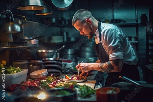 An expert chef confidently using culinary techniques to create a visually stunning and flavorful dish