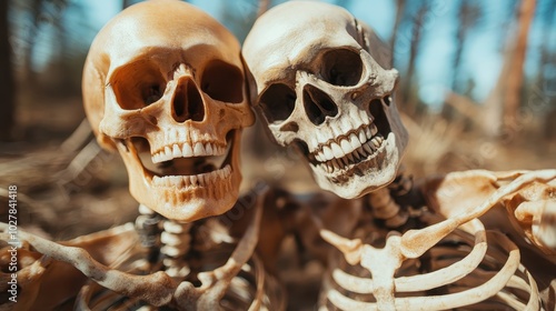 An extraordinary depiction of two skeletons experiencing joyful closeness in an outdoor setting, framed in a lighthearted, humorous tone that muses on life's temporal nature.