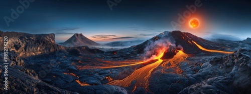 An extraordinary perspective of a remote volcanic island with a caldera lake and a rare, deep blue aurora australis illuminating the volcanic landscape with ethereal light, Volcanic island scene
