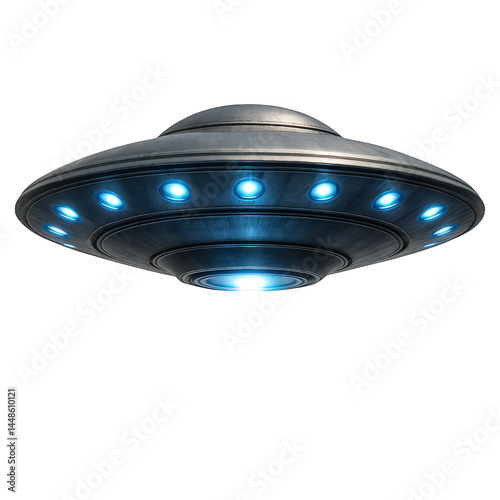 An iconic shiny metal flying saucer hovers, displaying a ring of vivid blue lights along its circular body and emitting a.