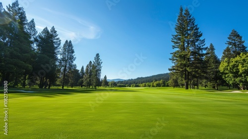 idylli, golf, course, setting, neatly, trimmed, golfing, essential, laid, out, classic, sporting, style, photo, leisure, precision, game, high, quality, image, highlighting, lush, greener, clear, sky