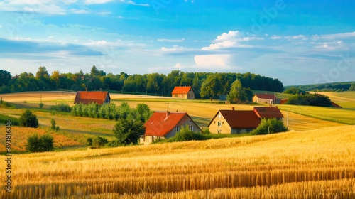 An idyllic rural landscape with specific cottages with red roofs, characteristic golden grain fields, emphasizing peace and harmony with nature.