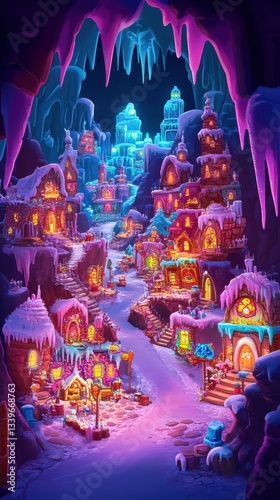 An illuminated colorful winter village inside a mystical cave setting