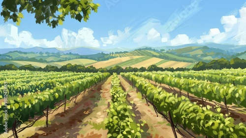 An illustrated vineyard landscape with rows of grapevines under a clear blue sky