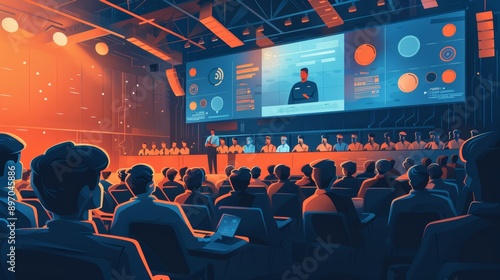 An illustration of a business conference, with a keynote speaker presenting to a large audience, with banners and corporate branding in the background.